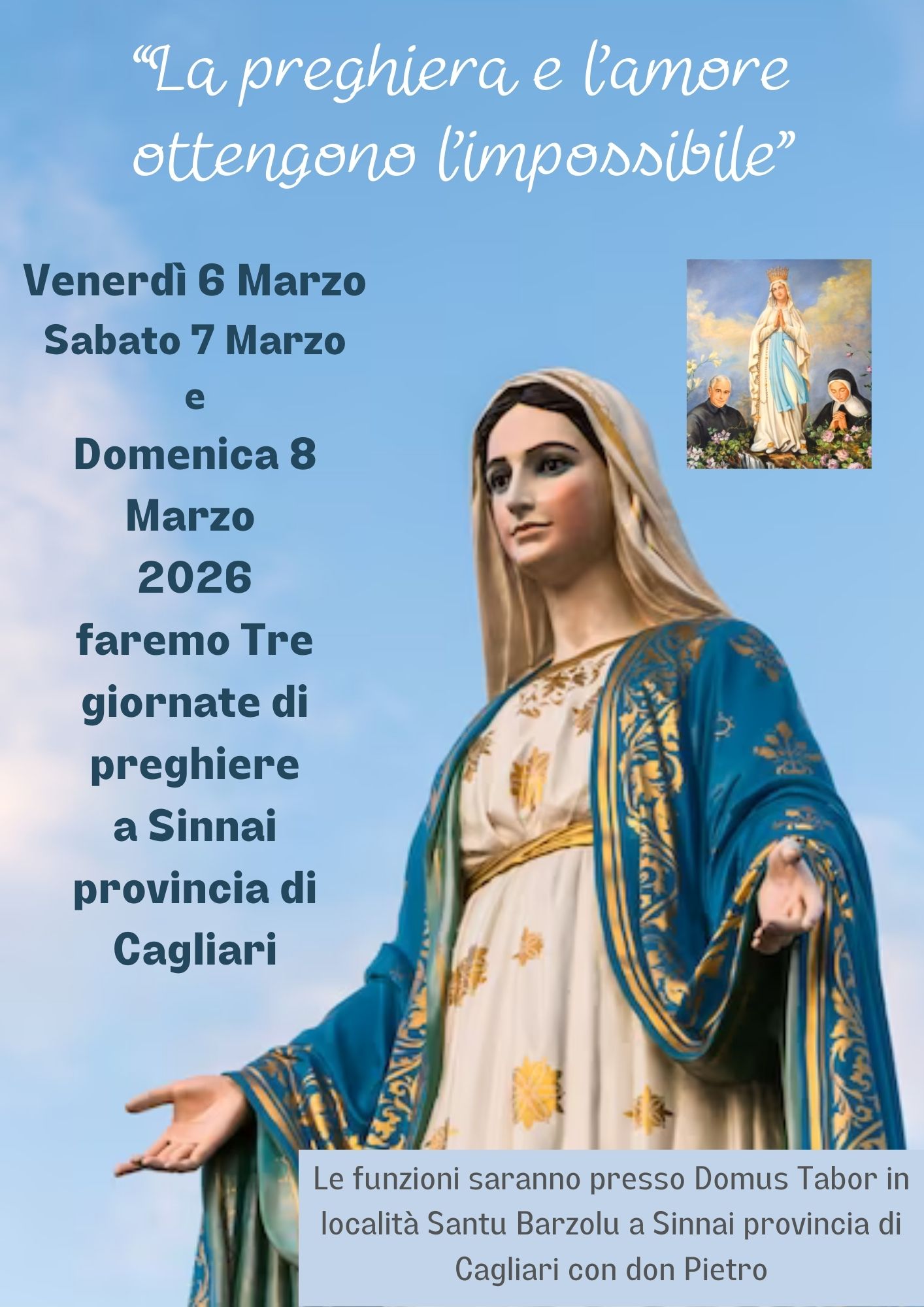 Venerdì 6, Sabato 7 e Domenica 8 Febbraio 2026 abbiamo organizzato tre giornate di preghiera con Pino di Missaglia, laico Carismatico fondatore dell’Associazione Nostra Signora di Lourdes. Le funzioni saranno presso la Chiesa Parrocchiale SS. Immacolata a Piazzolla di Nola in via venti Settembre N. 4, provincia di Napoli con don Salvatore.