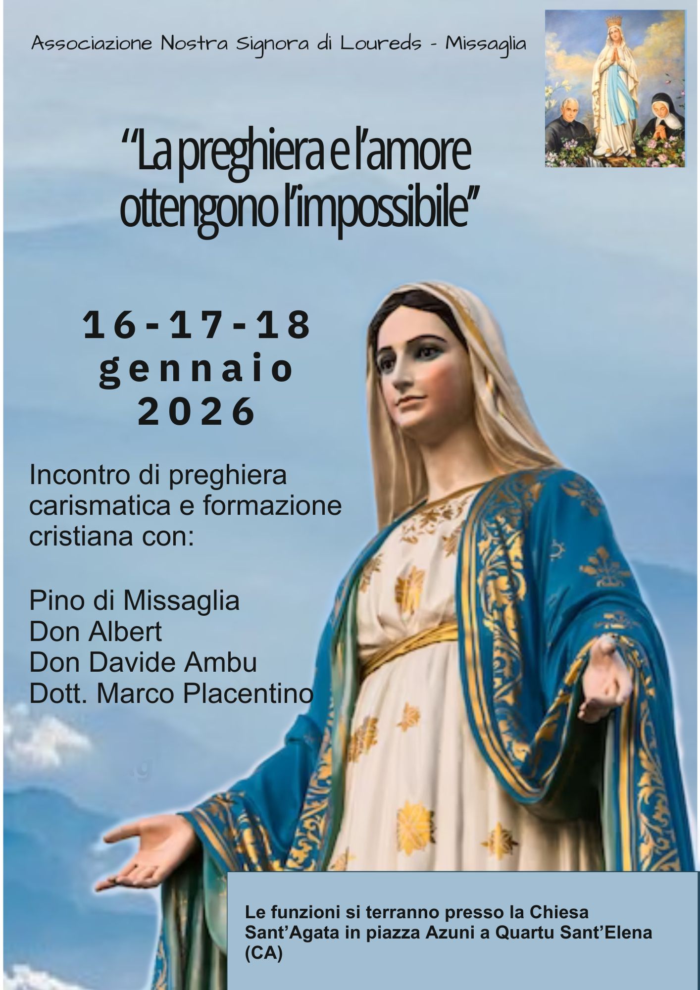Venerdì 16 Sabato 17 e Domenica 18 Gennaio 2026 abbiamo organizzato tre giornate di preghiera con Pino di Missaglia, laico Carismatico fondatore dell’Associazione Nostra Signora di Lourdes. Le funzioni saranno nella Chiesa Sant'Agata Piazza Azzuni a Quartu Sant'Elena provincia di Cagliari con don Alfredo.